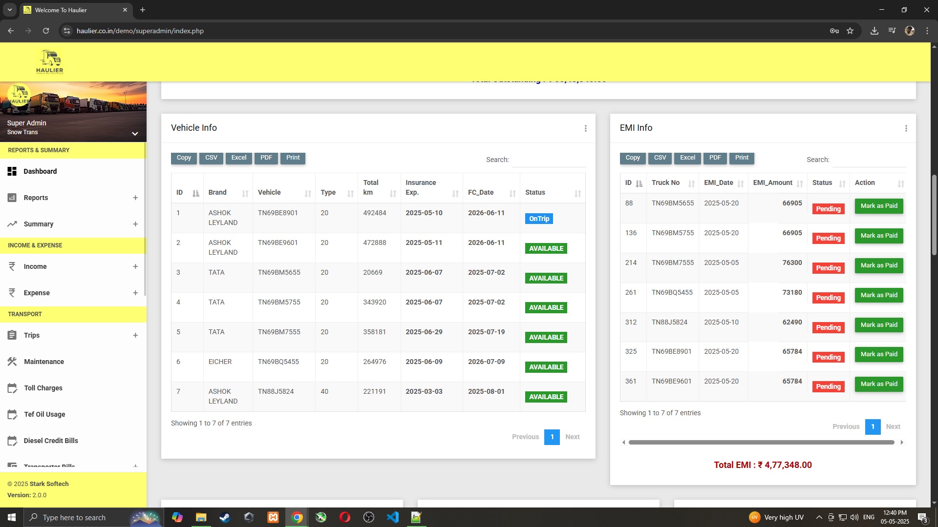 Track vehicle maintenance schedules and loan EMIs to keep operations running smoothly without surprises.